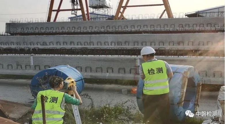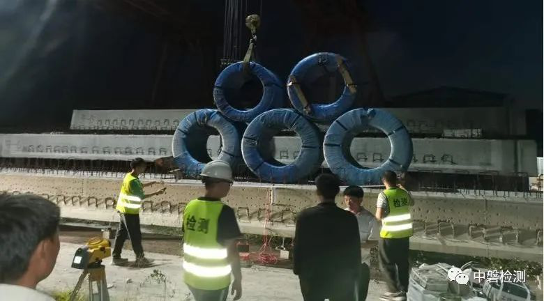 傍晚,检测人员正式开始静载试验。本次试验采用钢绞线堆载的方式进行加载,对梁体进行挠度情况、应力情况和裂缝状况分析。
