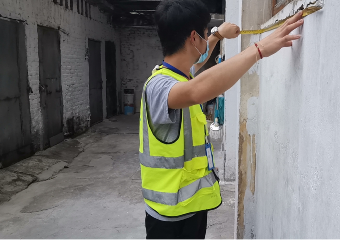 检测期间,向屋主了解清楚房屋的建造、改建和使用历史情况,同时采用拍照、描述、测量等方式记录现状,调查建筑物室内外的裂缝与损坏现状的原因,分析房屋的完损等级,并且布置裂缝监测点。时刻关注污水管网的施工情况,分析施工对房屋产生的影响。
