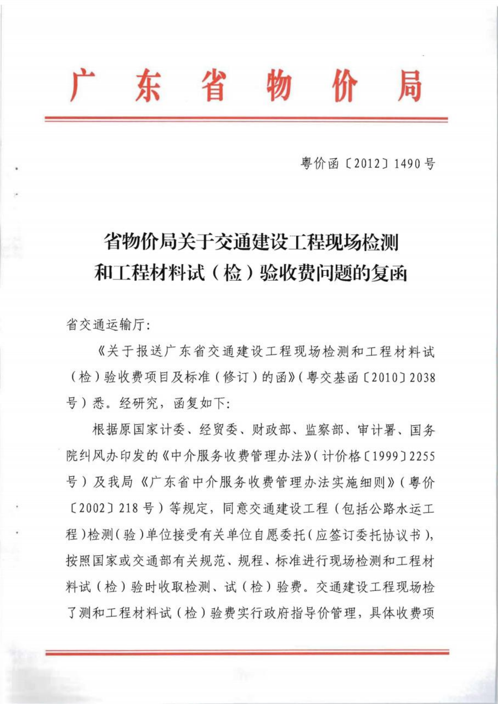 省物价局关于交通建设工程现场检测和工程材料试(检)验收费问题的复函(粤价函[2012]1490号).pdf
